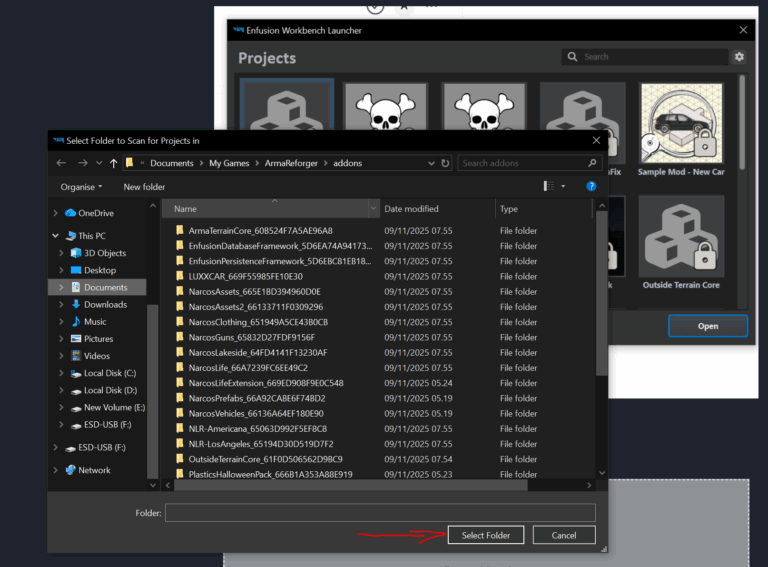 After pressing select folder, you should see local mods loaded into the Arma Reforger Workbench